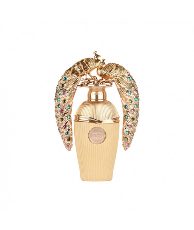 Флакон — настоящее произведение искусства: кремово-золотой корпус и два золотых павлина с сияющими камнями символизируют роскошь и изящество.