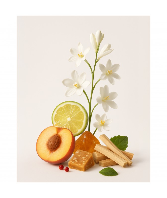 Он открывается мягкой фруктовой свежестью персика и бергамота, с лёгким штрихом розового перца.