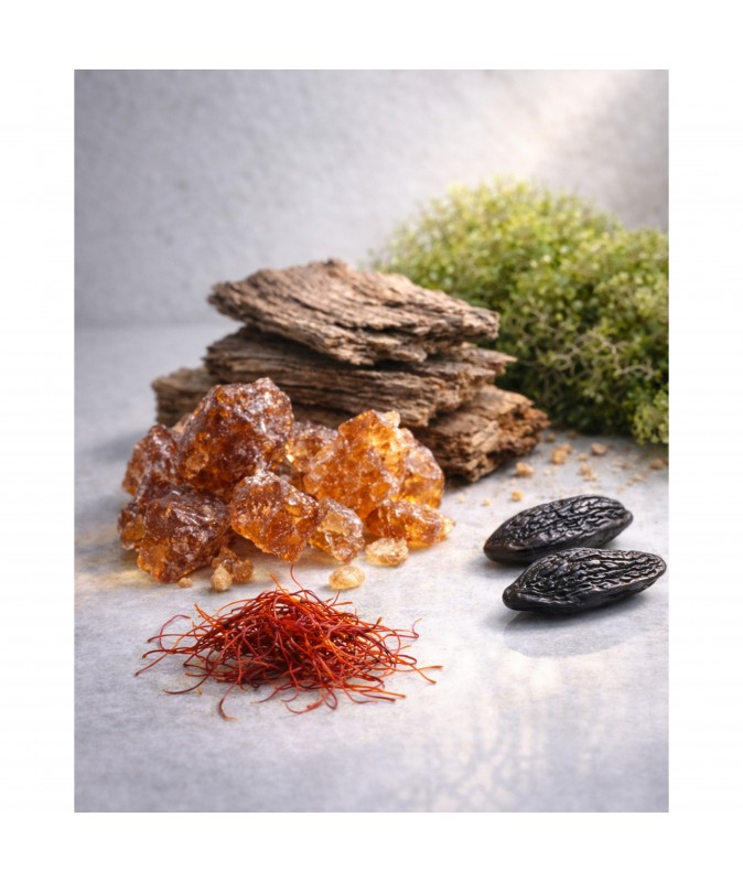 В сердце — шафран, древесные аккорды, пачули и бобы тонка: чуть пряно, чуть смолисто, с ощущением дорогой отделки.