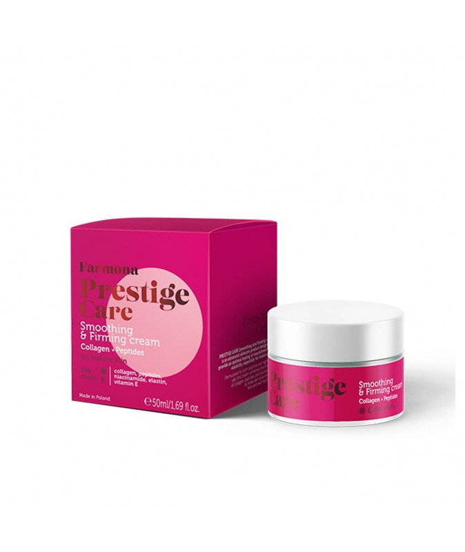 Омолаживающий крем Farmona Prestige Care Smoothing and Firming Day/Night Cream на основе пептидов и коллагена эффективно укрепляет кожу, разглаживает, питает и увлажняет. Крем способствует устранению дряблости и провисания кожи, обеспечивает длительное увлажнение, смягчает, замедляет появление возрастных изменений, разглаживает мелкие морщинки и уменьшает глубину крупных заломов. Средство повышает эластичность и упругость кожи, освежает, выравнивает тон лица, придает свежесть. Разработанный как для дневного, так и для ночного использования, этот крем сочетает в себе преимущества коллагена, пептидов и ниацинамида, чтобы сделать кожу гладкой, упругой и хорошо увлажненной.