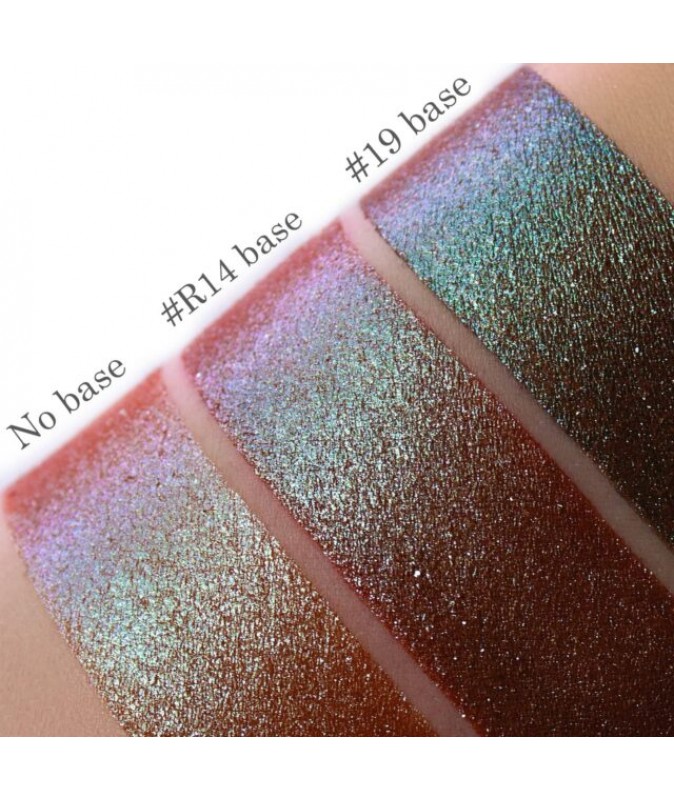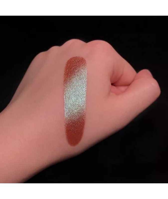 X 11 – плотный дуохром коричнево-зелено-синий. Мягкий и шелковистый, при нанесении похож на кремовую тень. Можно использовать соло (более прозрачный эффект), но для большей стойкости подойдет любая база под тени.