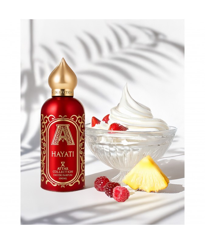 Аромат принадлежит к группе цветочные фруктовые. Hayati выпущен в 2018 году. Верхние ноты: Малина, Ягоды и Ананас. Средние ноты: Взбитые сливки, Мед, Черная смородина, Слива и Цветочные ноты. Базовые ноты: Мороженое, Ваниль и Белый мускус.