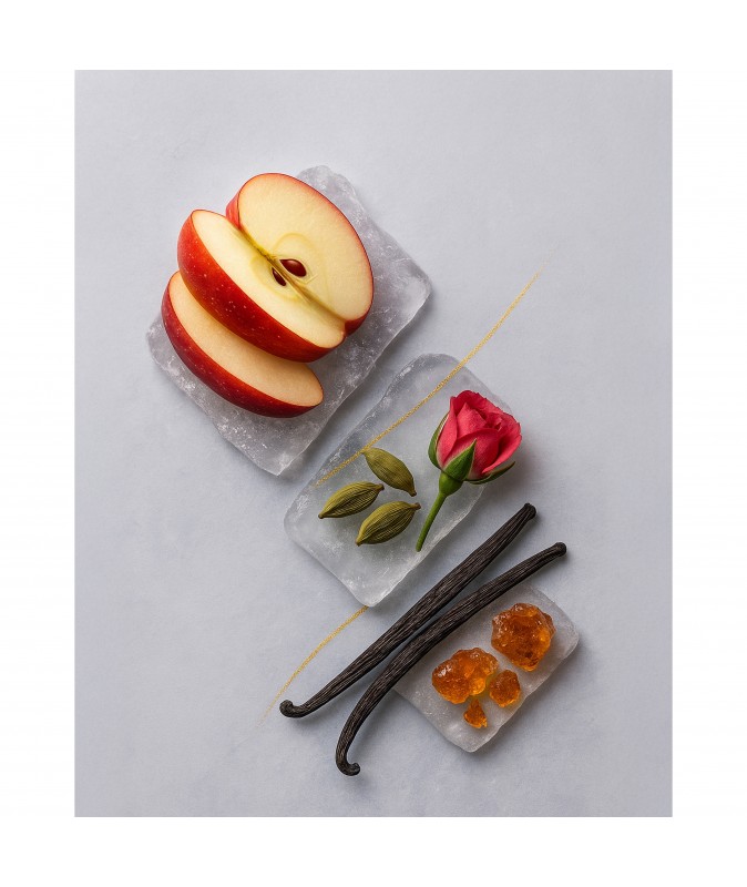 Первый вдох — как горячий яблочный сидр из зимнего маркета: сочное красное , кардамон и лёгкий травяной ликёр даваны. Сладко, пряно, тёпло — как будто внутри сразу становится на пару градусов теплее.
