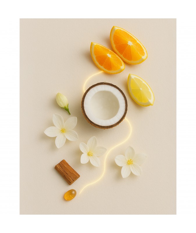 Через пару минут раскрывается самое вкусное: сливочный кокос, белые цветы и мягкий сандал, к ним добавляется прозрачный мускус и тёплая смолистая база.
